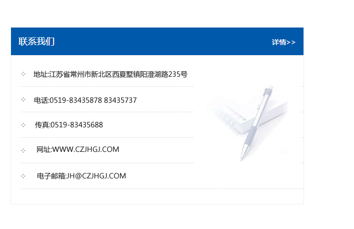 地址:常州市新北區(qū)友邦商務(wù)大廈1幢16、17層  電話:0519-85101652  傳真:0519-85112595  郵編:213022  網(wǎng)址:www.cz-jiayue_cn.yzruijin.com  郵箱:xiajifengaa@163.com